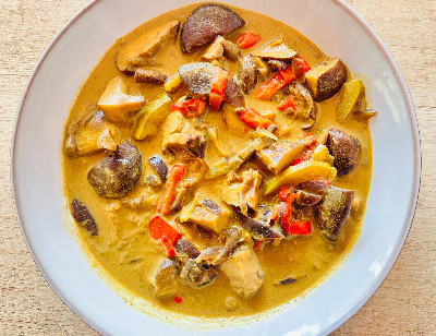 shiitake, zucchini, red bell pepper, red onion, coconut milk, curry, masala, natural condiments, non iodized sea salt, gluten free
